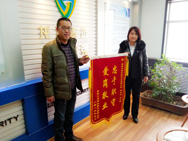 2015年1月份,一位八十多岁高龄的老人到张家口市商业银行某支行办理取钱业务时,因老人年事已高患有老年病,与银行的工作人员发生了冲突,无论工作人员如何解释,仍无法沟通,至此,老人经常到该行找工作人员滋事,老人的行为严重影响到支行的正常业务,为客户办理业务带来了不便,为维护好银行正常秩序,我公司派驻支行的保安队员顾龙液、王文来,主动接近老人进行劝阻,交流沟通,问寒问暖,缓解老人心态。之后我公司曹文平队长得知此事,也赶到支行协助处理,帮忙找到了老人的家人,在家人的劝说下,老人离开了支行,支行恢复了正常的工作秩序。经过此事,我公司保安大队长曹文平及派驻到张家口市商业银行的保安队员顾龙液、王文来受到了张家口市商业银行支行领导的高度赞扬,特到我公司送来了锦旗与表扬信,对我公司进行感谢。