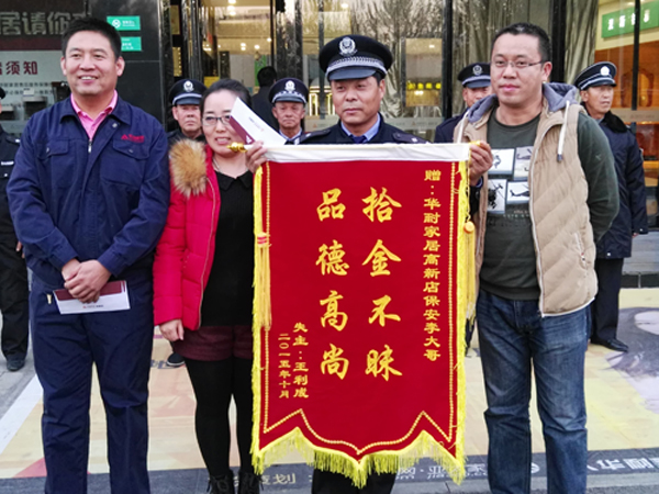 2015年10月23日18是许,保安李明宝在当日营业结束清场检查时,在张家口华耐高新店商场南区3层卫生间捡到1只皮挎包,立即教到物业部值班室,经值班人员共同检查,内有包括汽车钥匙、多张信用卡、驾驶证等物品。19时30分,失主前来寻找。次日上午,为感谢李明宝,失主专程送来“拾金不昧,品德高尚”锦旗一面。